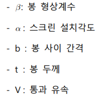 ○ 스크린을 통과하는 폐수의 통과유속은 유속이 너무 느릴 경우 퇴적물이 발생하고 막힘 환경설비 시스템 기술정보집 2 현상이 일어날 수 있어 최소 0.45m/s 이상을 유지하고 유속이 너무 빠를 경우 수두손실 과 스크린의 손상과 같은 문제가 생길 수 있어서 최대 0.9m/s를 유지한다.