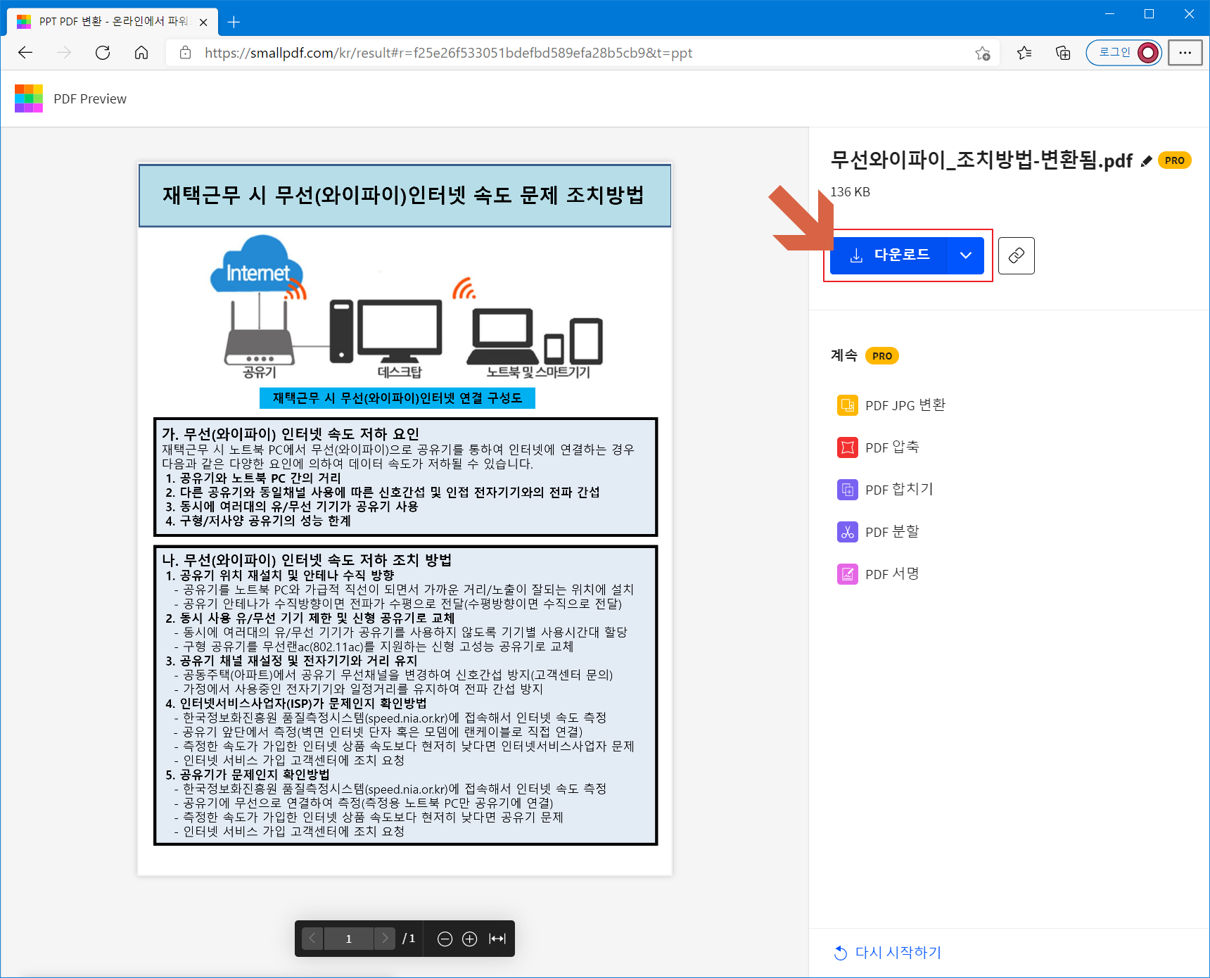 PPT에서 PDF로 변환이 완료되었습니다. <다운로드>를 선택합니다.