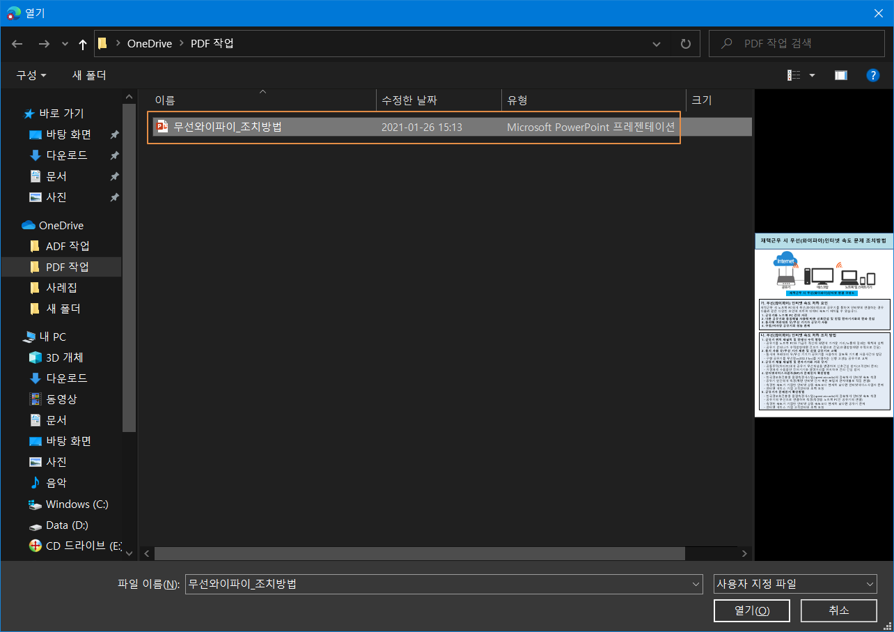 PPT 확장자를 갖는 PDF로 변환될 파워포인트 파일을 선택합니다.