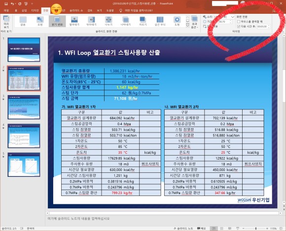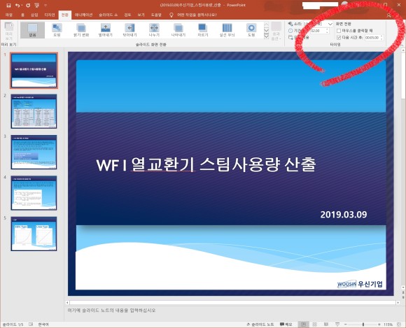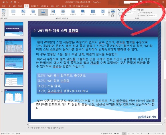 > 화면전환 메뉴에서 "마우스를 클릭할 때" 체크를 빼고, 아래에 "다음 시간 후"에 시간을 입력합니다.