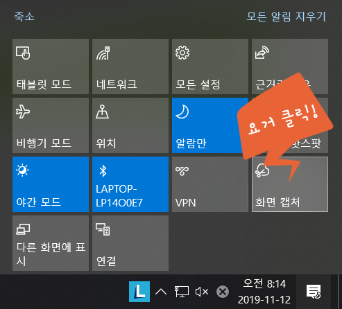윈도우10 알림센터를 열고 "화면캡처" 클릭하면 화면을 캡처할 수 있는 프로그램이 실행됩니다.