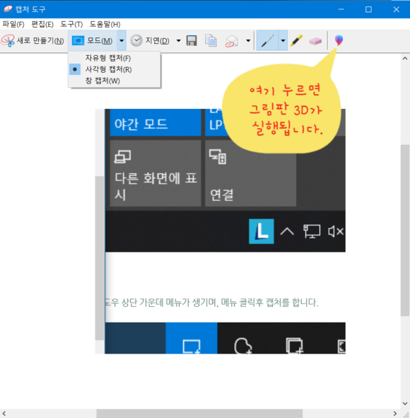 자유형, 사각형, 창 캡처 이렇게 모드는 세가지이며, 지연시간 설정이 가능하고 바로 "그림판 3D" 라는 윈도우 기본 이미지 편집프로그램이 실행됩니다.