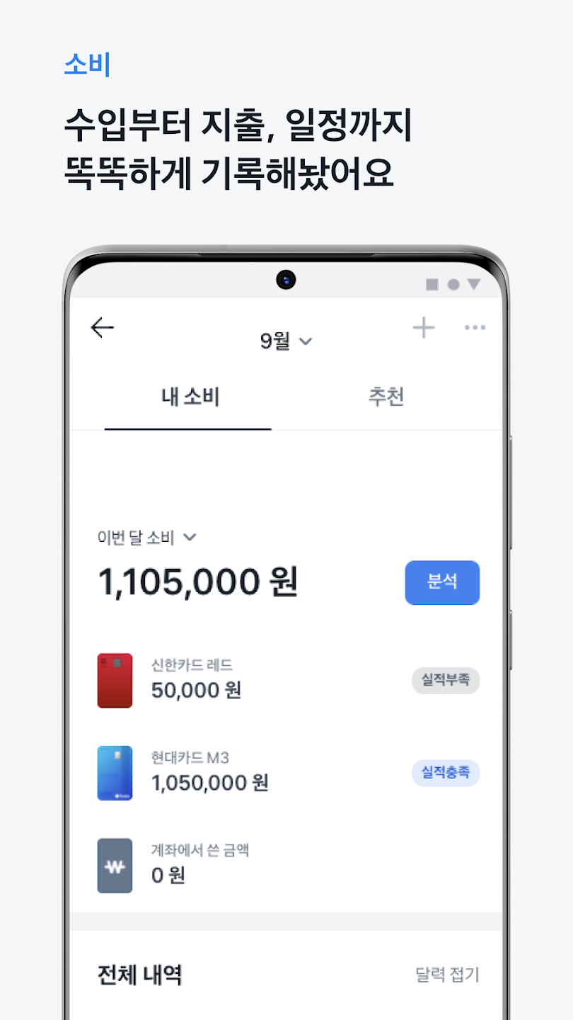 · 얼마나 벌고 얼마나 썼을까? 한 달 동안의 수입과 소비를 시간순으로 모아볼 수 있고, 소비 분석 리포트도 가능
