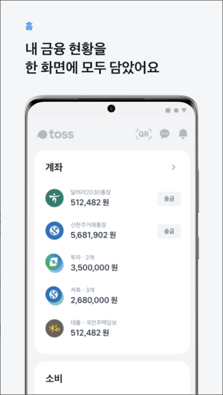빠르고 안전한 송금, 한눈에 확인하는 모든 내 금융현황 및 거래내역, 내게 필요한 다양한 금융 상품 개설까지. 모두 토스 하나로 가능합니다.