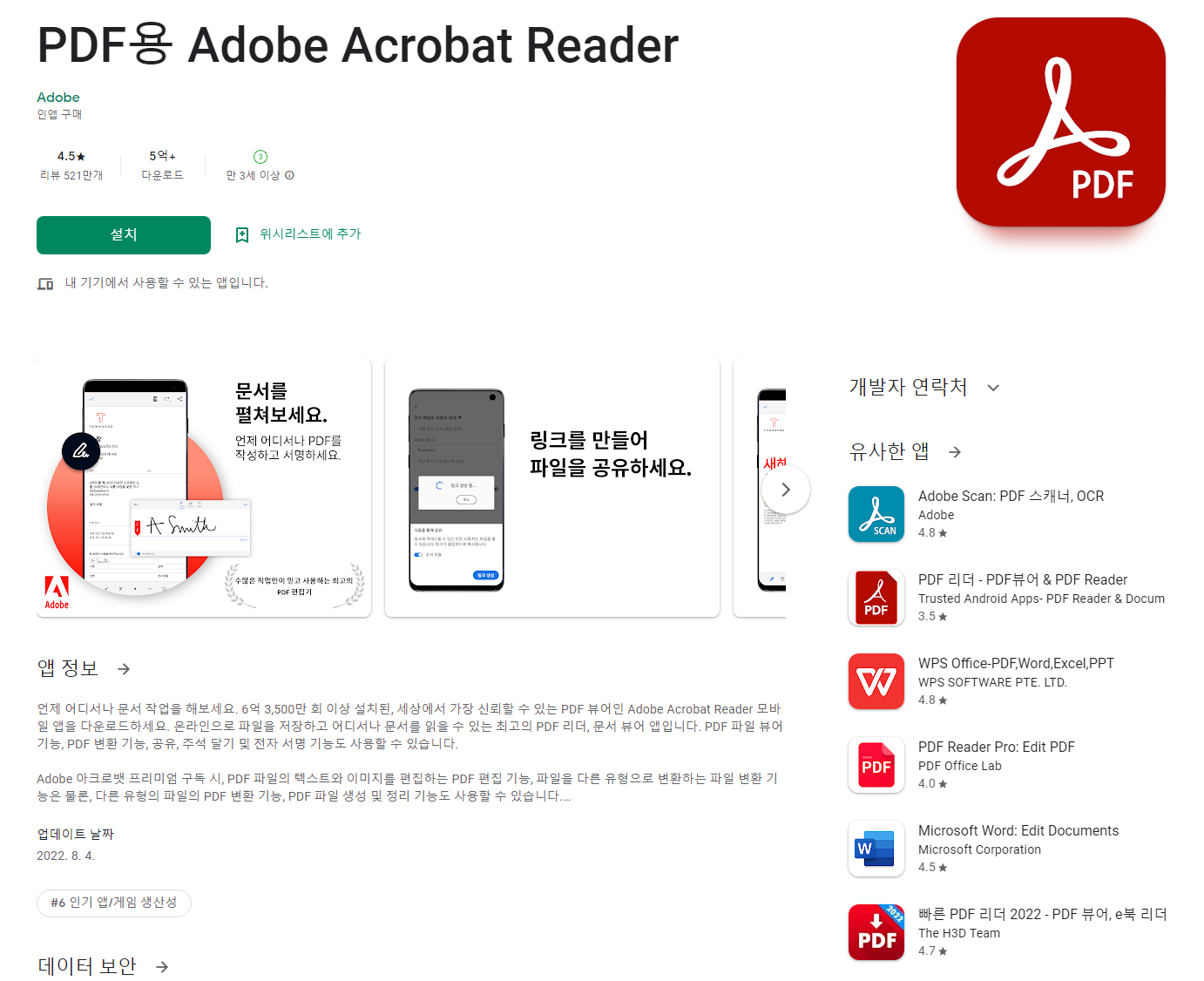 세상에서 가장 신뢰할 수 있는 PDF 뷰어인 Adobe Acrobat Reader 모바일 앱, 6억 3,500만 회 이상 설치된 언제 어디서나 문서 작업을 해보세요