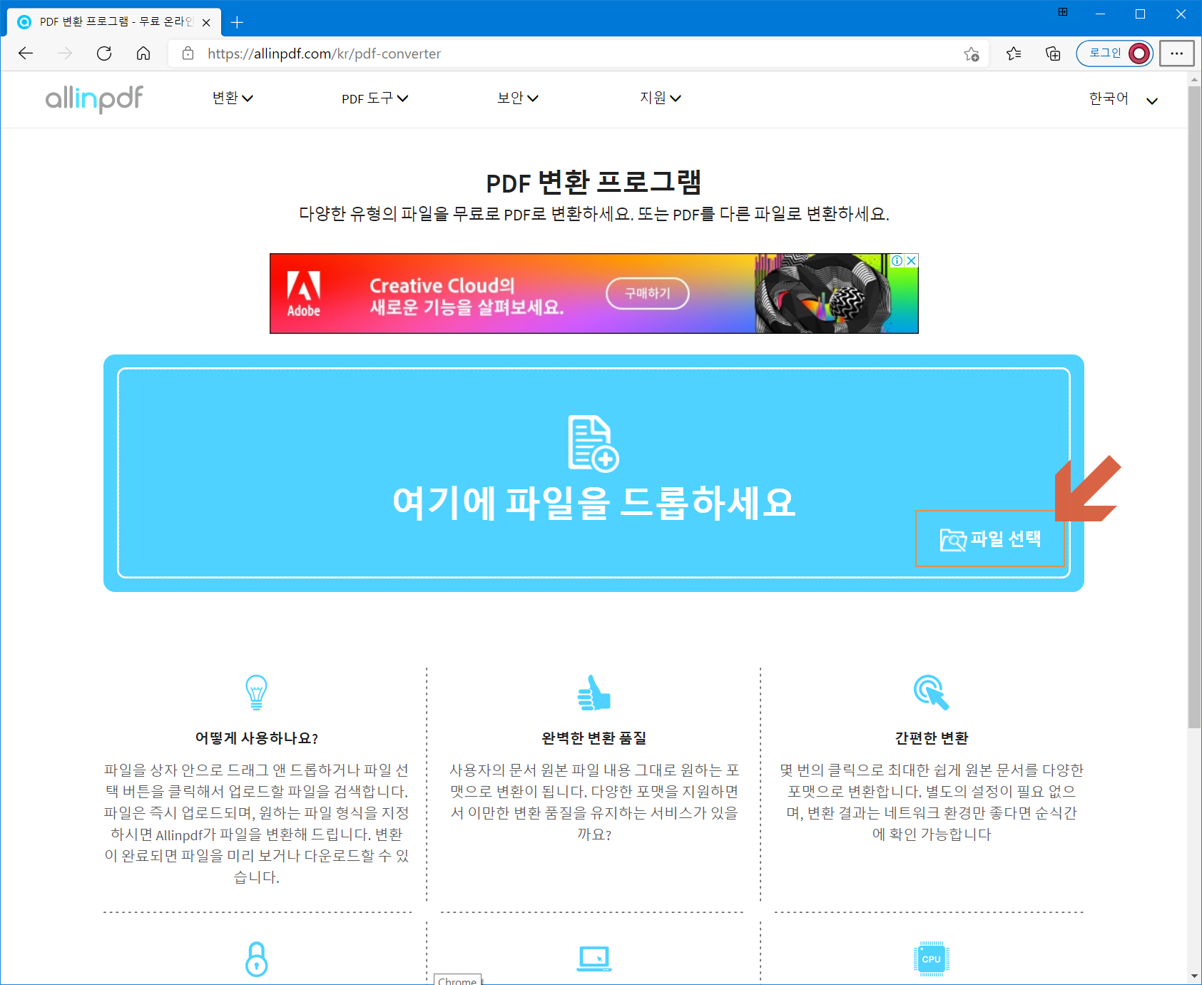 온라인 PDF 변환 프로그램 페이지로 접속합니다. <파일 선택>을 누릅니다.