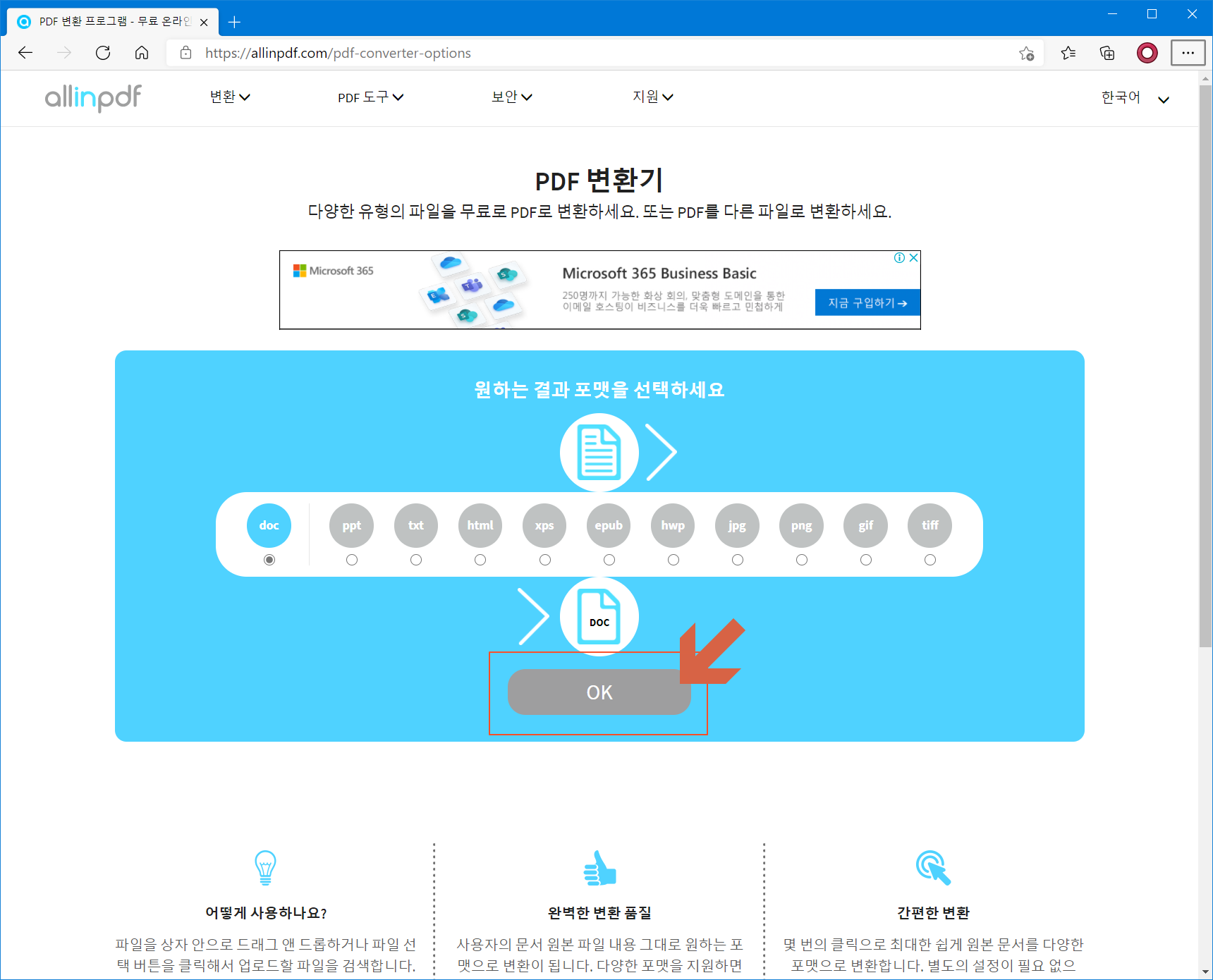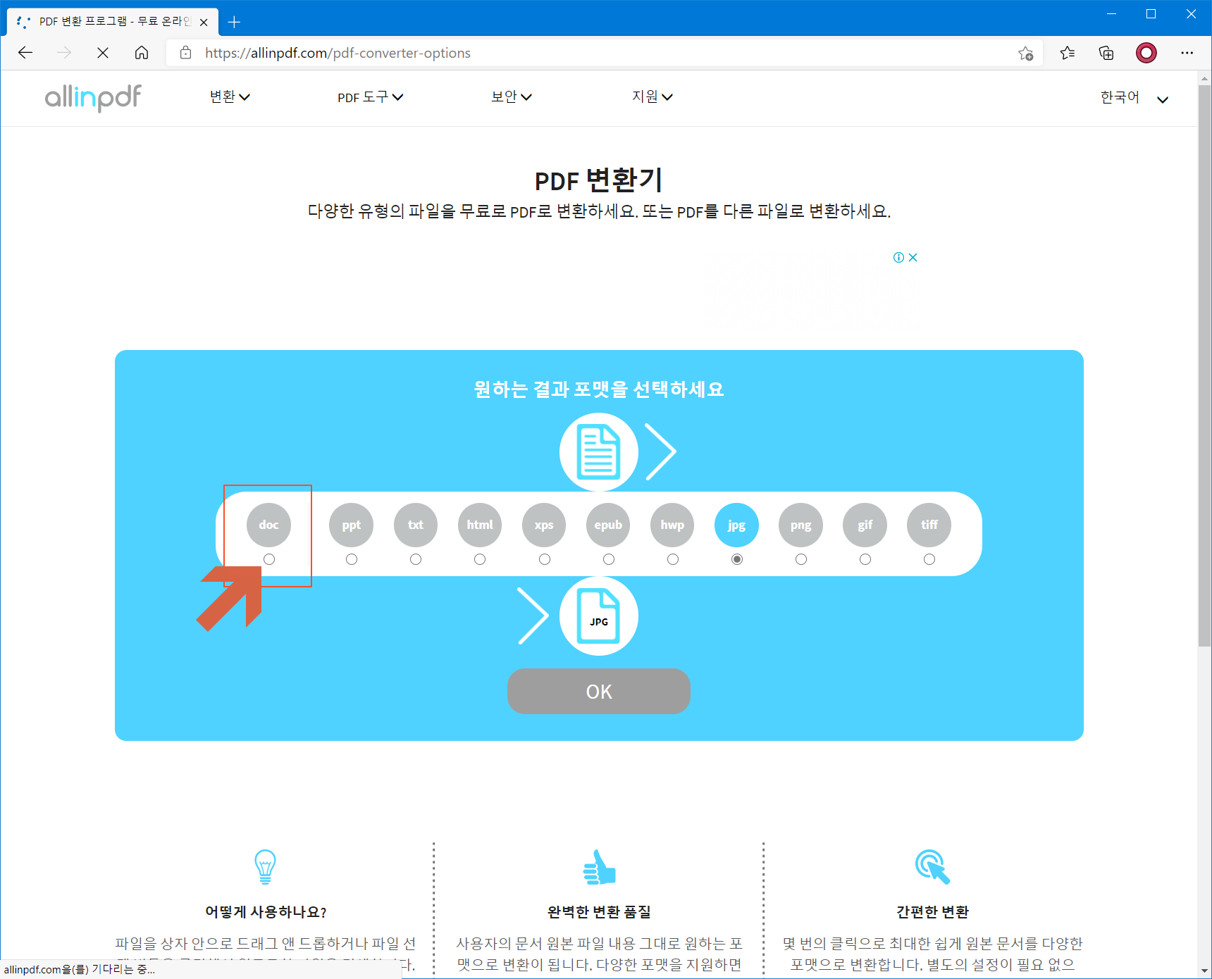 워드로 변환하려고 하기에 <doc>를 선택합니다.