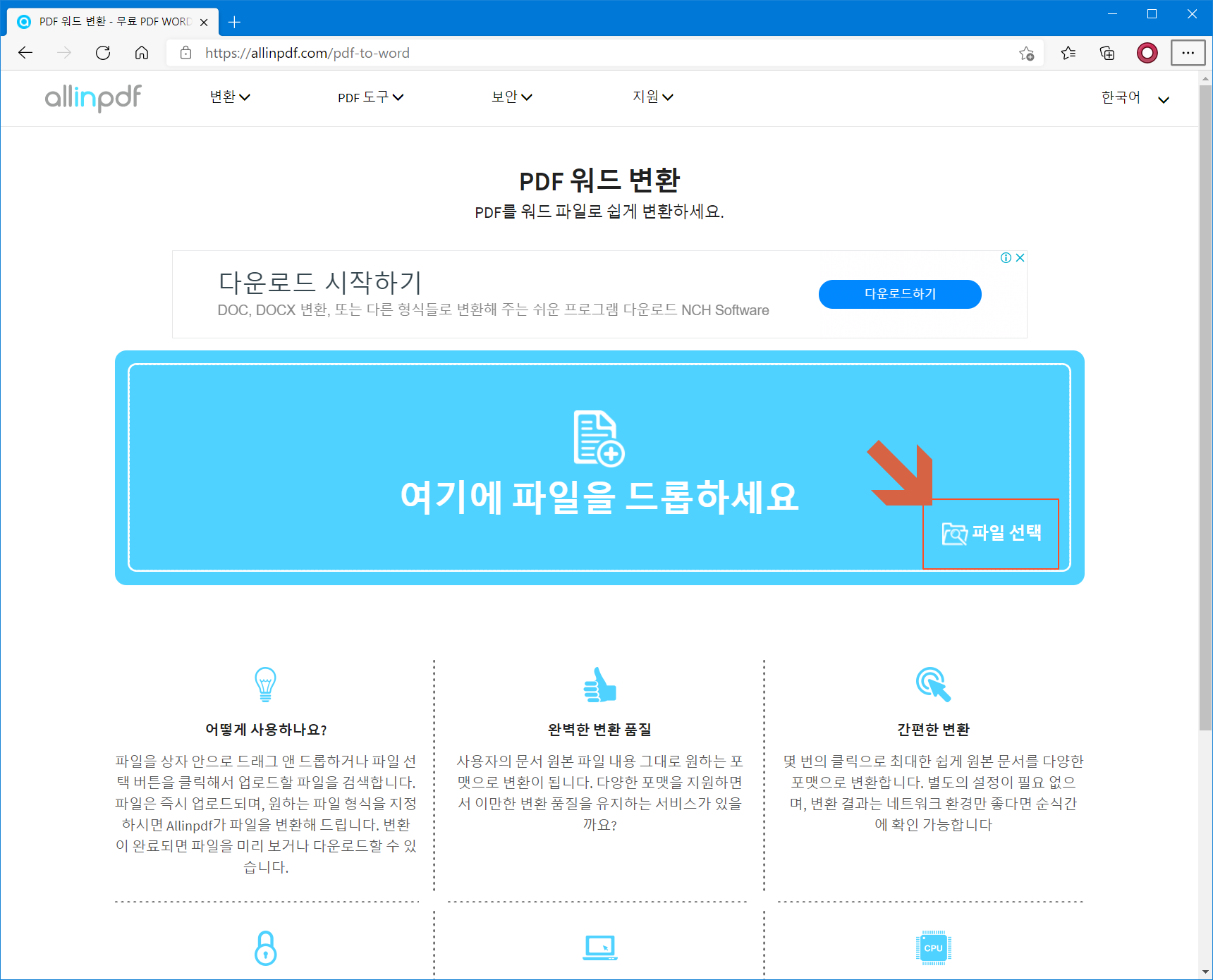 PDF 워드 변환 사이트로 접속합니다. <파일 선택>을 누릅니다.