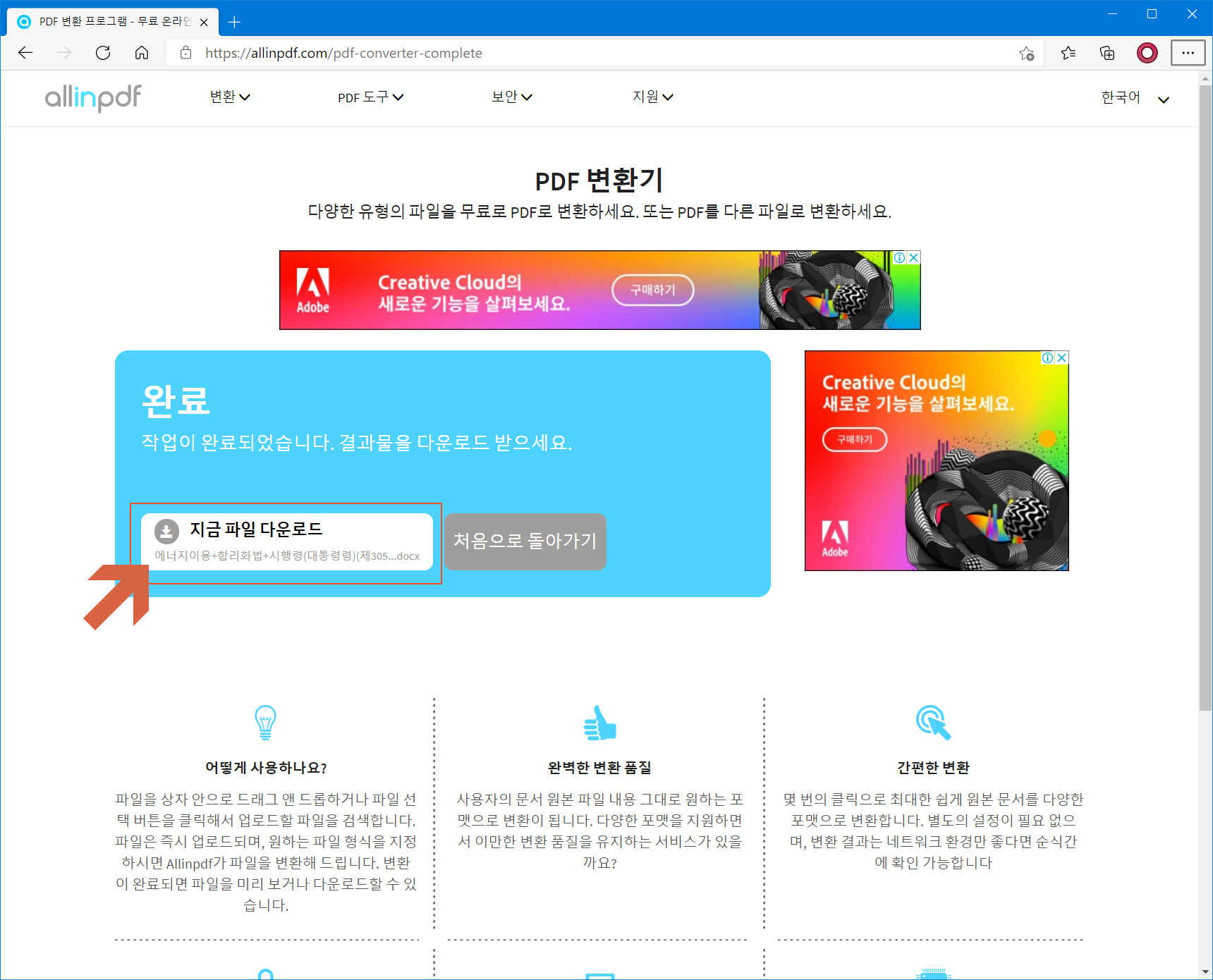 PDF 파일이 doc 파일로 변환 작업이 완료되었습니다. <지금 파일 다운로드>를 선택합니다.